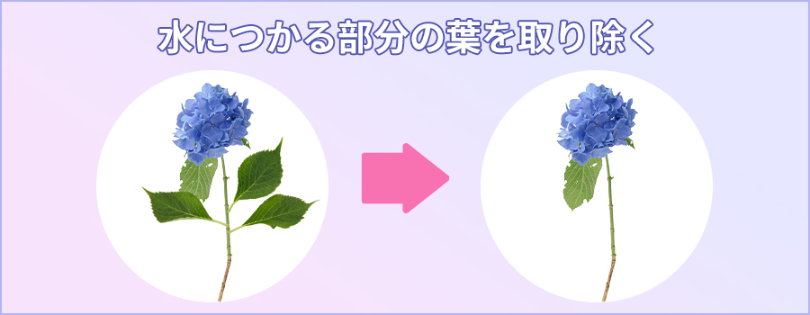 紫陽花にはみずみずしい大きな葉がついていますが、水揚げの前にできるだけ取り除いておきましょう。
