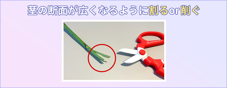 茎の先端をナイフで削ぐか、ハサミで縦に割ります。