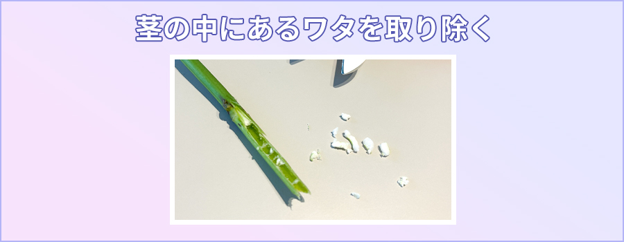 茎の中に白いワタが詰まっていますので、ハサミの先端などを使って掻き出すように取り除きましょう。