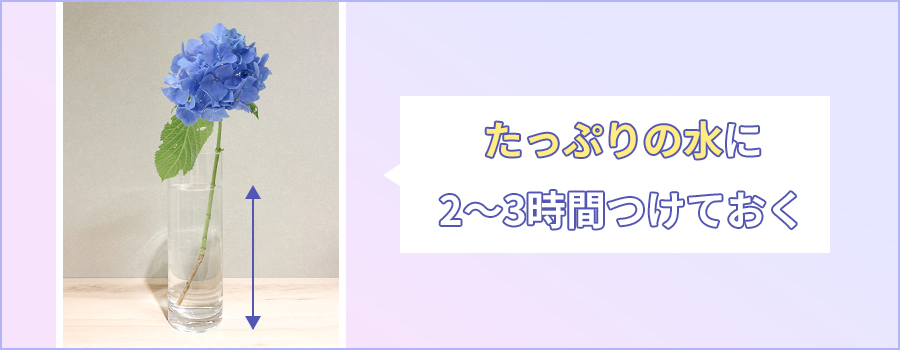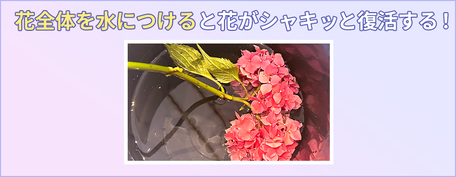 たっぷりの水に生けていても紫陽花に元気がなくなってしまう場合は、花全体を丸ごと水につけるのがおすすめ。