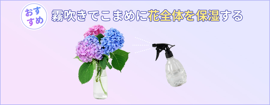 たっぷりの水に生けると同時に、霧吹きを使って花の部分も保湿してあげましょう。