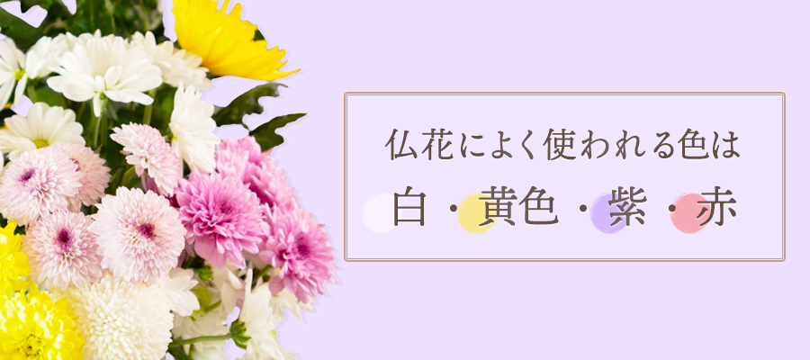 お供えにおいては花の種類よりも、色が重要視されることが多くあります。 仏花としてよく使われるのは、「白・黄色・紫・赤」のお花。