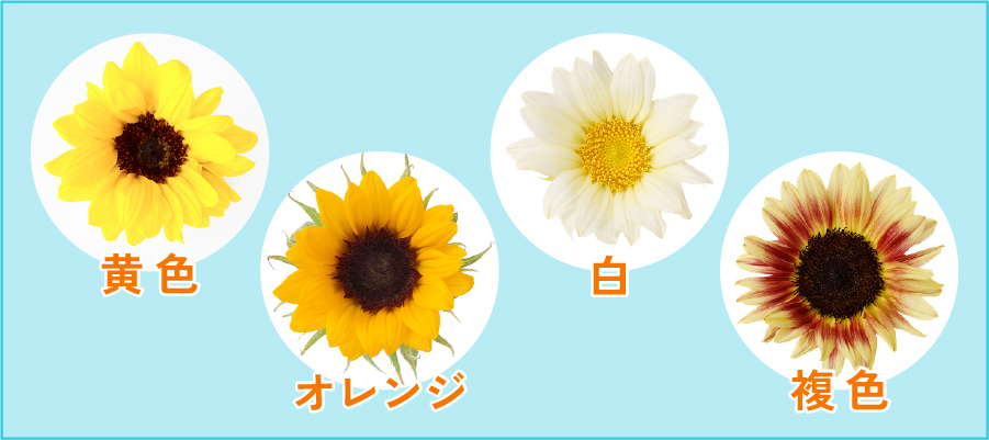 花びらの色だけでなく、花芯の色や咲き方にも種類があるので、同じひまわりでも全く異なる印象を作れます。