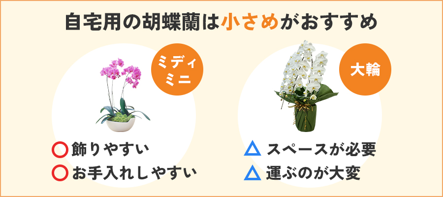 自宅で胡蝶蘭を楽しむのであれば、小さめサイズで飾りやすいミディ胡蝶蘭やミニ胡蝶蘭がおすすめです。