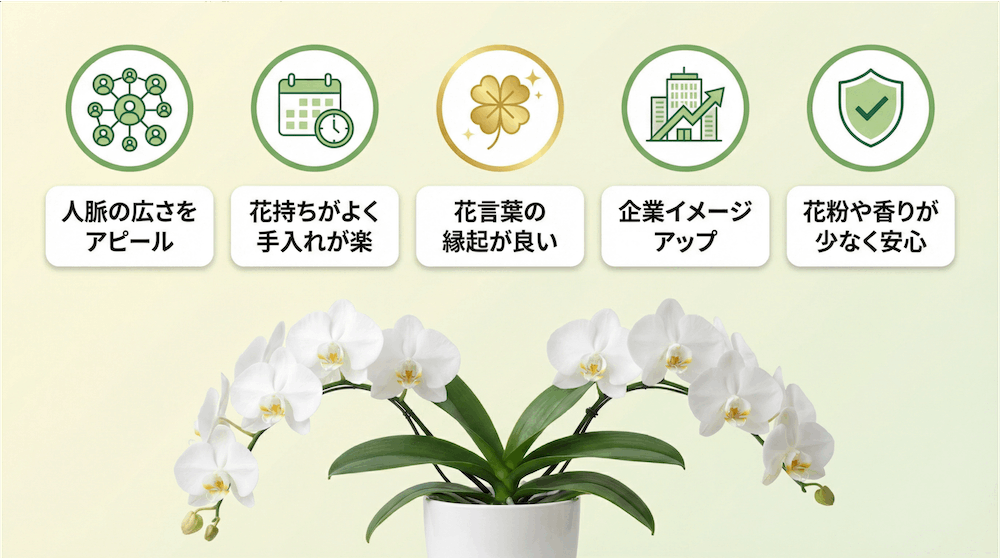 胡蝶蘭が経営者が経営者に喜ばれる理由としては人脈の広さのアピールや来客に対して企業のイメージアップに繋がる点、または胡蝶蘭の花言葉や花持ちの良さなどが喜ばれています。