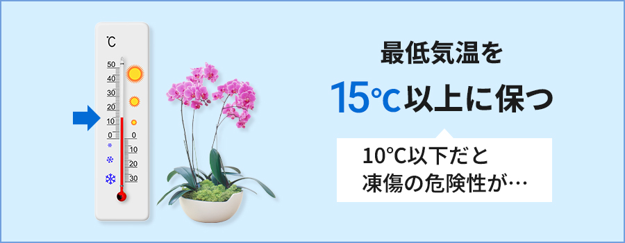 冬場は、胡蝶蘭の鉢周りの気温を最低でも15℃以上に保ちましょう。