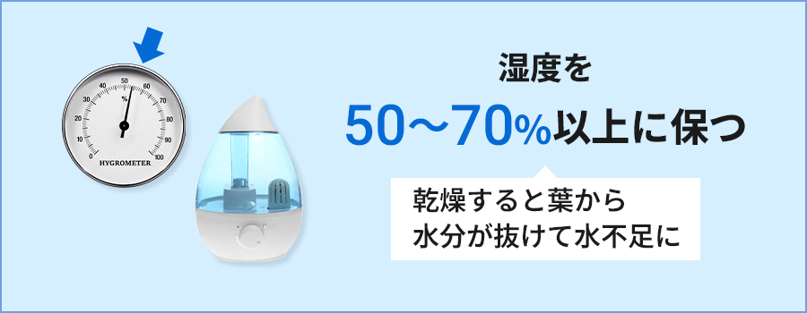 湿度が低くなると、乾燥で葉から水分が蒸散して水不足を起こしてしまう恐れがあります。