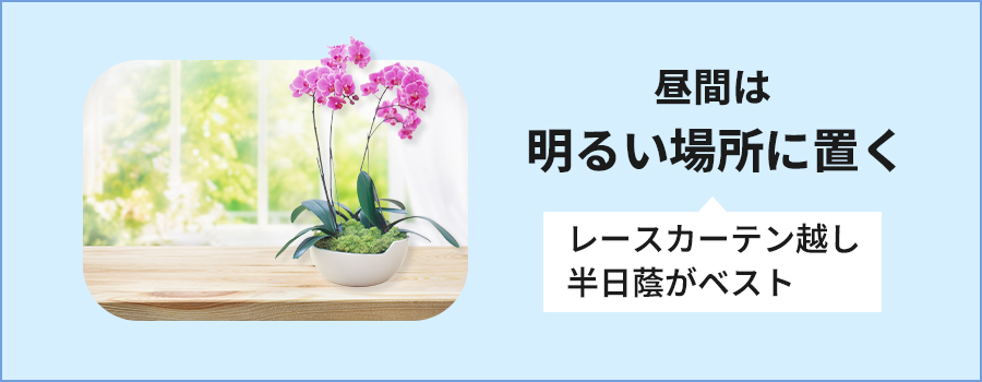 ただし、胡蝶蘭は夜間に光合成で使う二酸化炭素を蓄える性質があるため、光が当たらない時間もしっかり作りましょう。