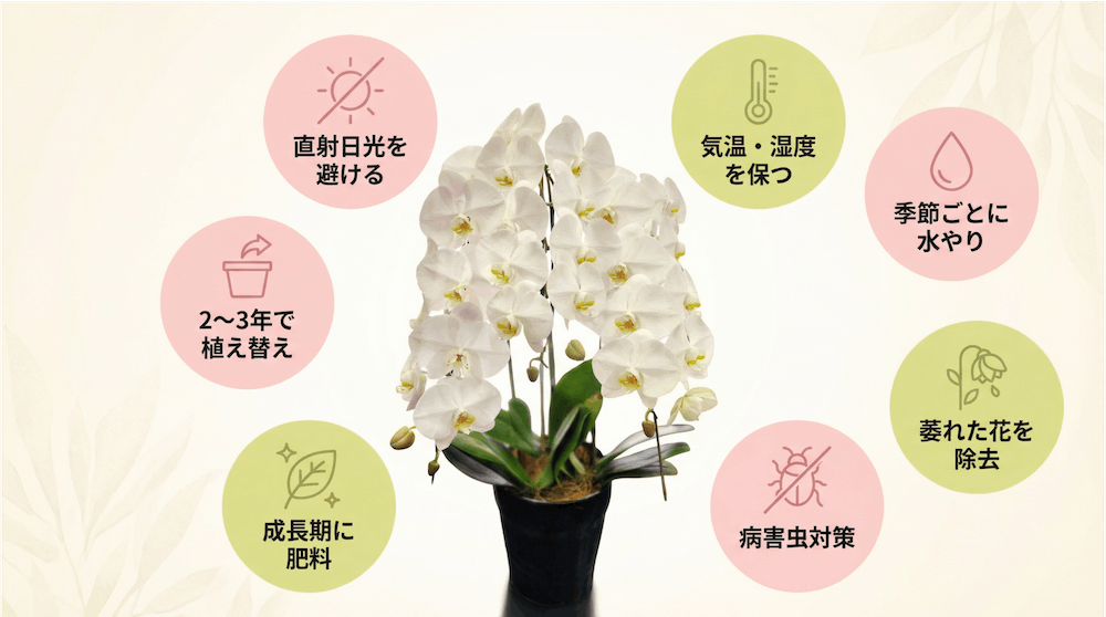 胡蝶蘭に発生しやすい病害虫や、対処法については「【お手入れガイド】胡蝶蘭の病害虫対策」を参考にしてくださいね。