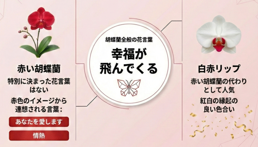 「幸福が飛んでくる」という胡蝶蘭に共通する花言葉や、鮮やかな赤が「あなたを愛しています」「深い愛情」を象徴するからです。