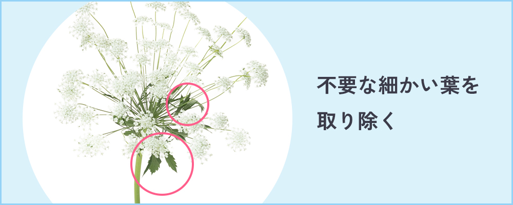 また、レースフラワーは水下がりがしやすいため茎の切り戻しや花瓶の水替えを毎日行うとより長く楽しめますよ。