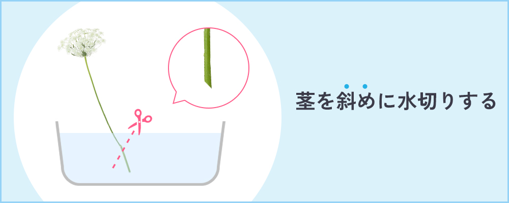 水につかった茎は傷みやすいので、茎の状態を確認して、ぬめりや痛みがあるようなら茎の切り口を斜めにカットしましょう。