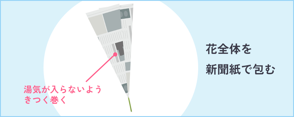 隙間から湯気が入らないよう、茎の先端数㎝を残して花全体を新聞紙できつく巻きます。