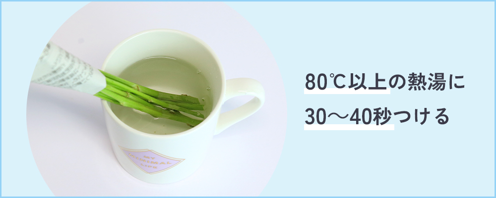 熱湯に長くつけると茎が痛むリスクがあるため、30~40秒ほどしたら取り出しましょう。