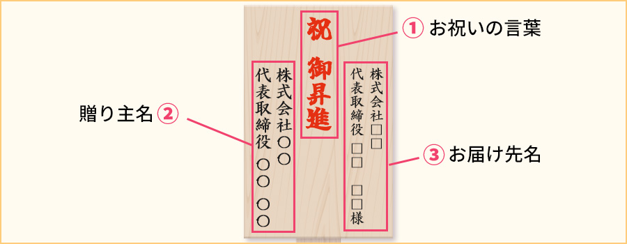 昇進祝いの花に立札をつけたいのですが、どう書けばいいか分かりません。何を書けばいいですか?