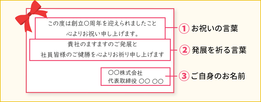 株式会社〇〇様 この度は創立〇周年を迎えられましたこと 心よりお祝い申し上げます 貴社のますますのご発展と 社員皆様のご健勝を心よりお祈り申し上げます 株式会社△△ 代表取締役 □□
