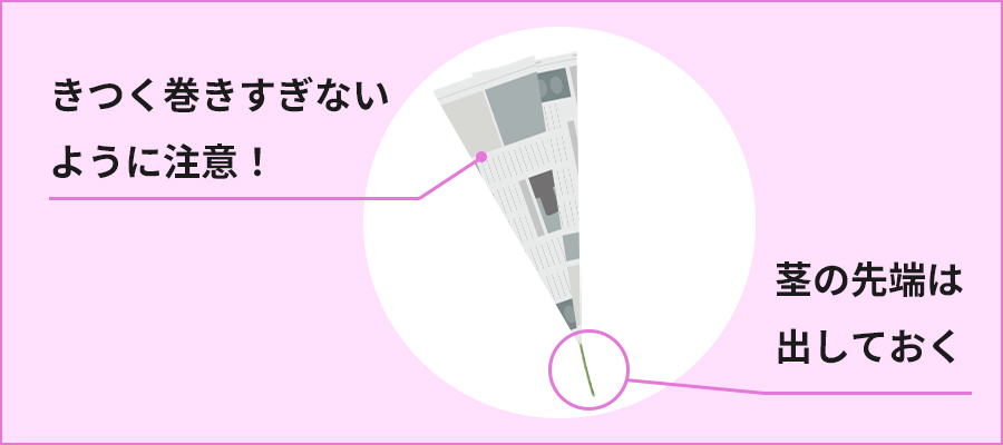 新聞紙で巻く際、きつく固定しすぎると花びらが潰れてしまう場合がありますので注意しましょう。