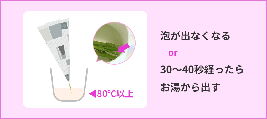 お湯につける時間が長すぎると茎が傷んでしまうため、30~40秒経ったらお湯から出すようにしてください。
