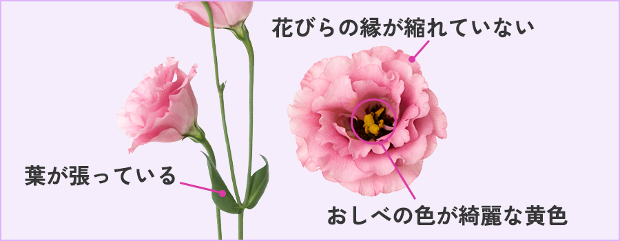 トルコキキョウは、一番外側の花びら、おしべの色、葉をチェックして新鮮なものを選びましょう。